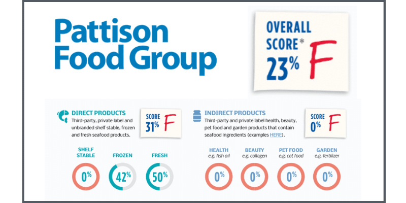 In a new Seafood Progress report, Pattison Food Group (PFG) scores in last place across all retailers at 14%, indicating the major retailer is nowhere near taking accountability for the seafood it sells amid mounting evidence of environmental and human rights crimes in seafood supply chains.